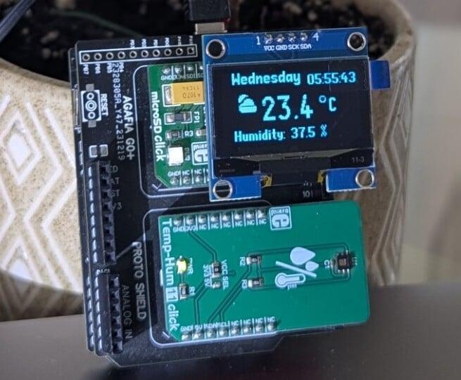 The system captures room temperature and humidity using the Mickroe Click Boards TempHum (HDC1080) Click board, periodically logs the data onto a MicroSD card, and presents it on a SH1106 OLED display with a beautifully designed interface. A real-time clock (RTC) provides date and time stamps for logging. Users can interact with the system via serial commands to set the RTC, read logs, or clear logs.
