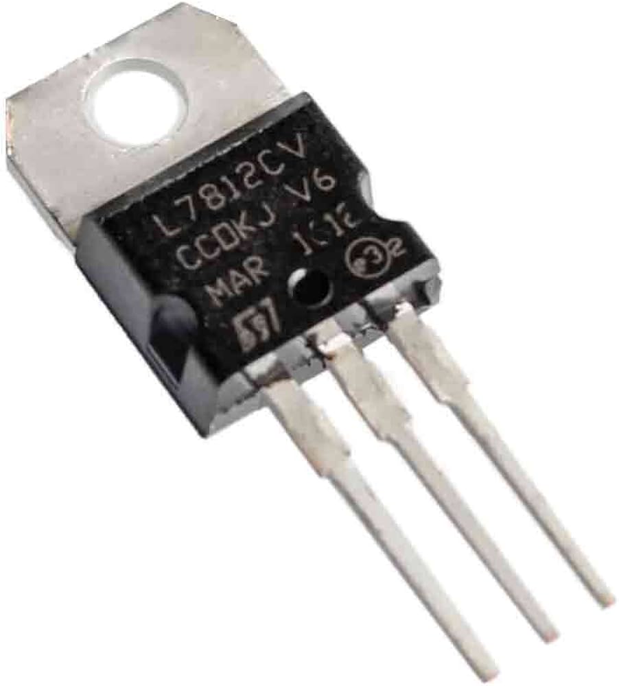 The L7812CV is a positive voltage regulator IC from the L7800 series by STMicroelectronics. Used in power supplies, DC motor controls, and other circuits requiring a stable 12V output.
